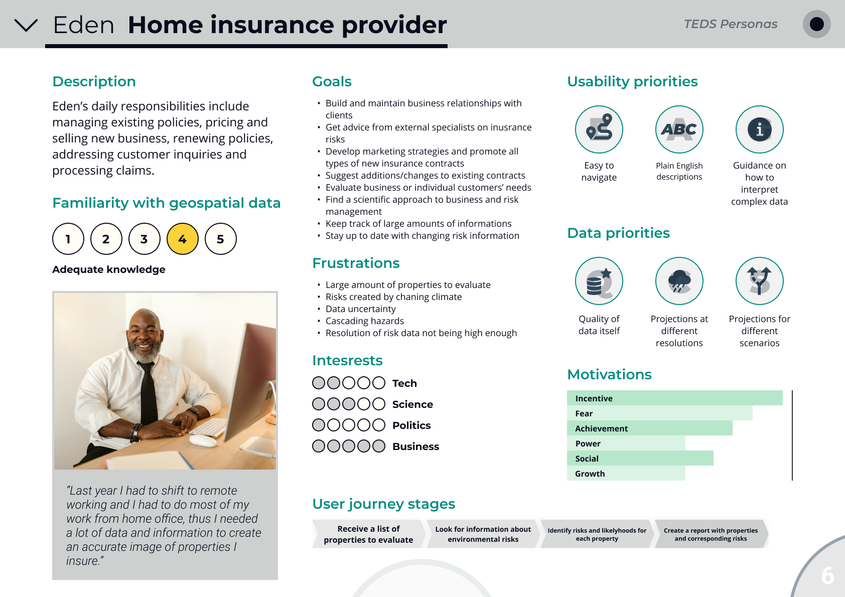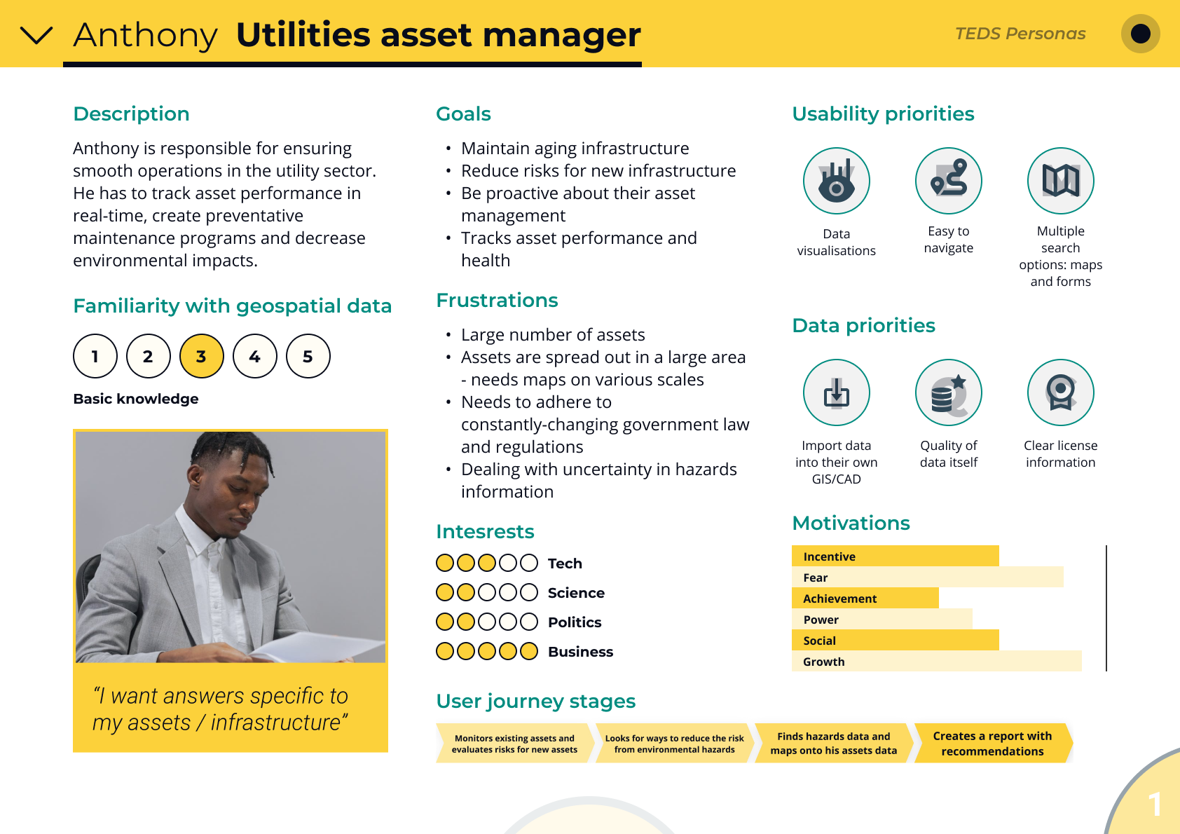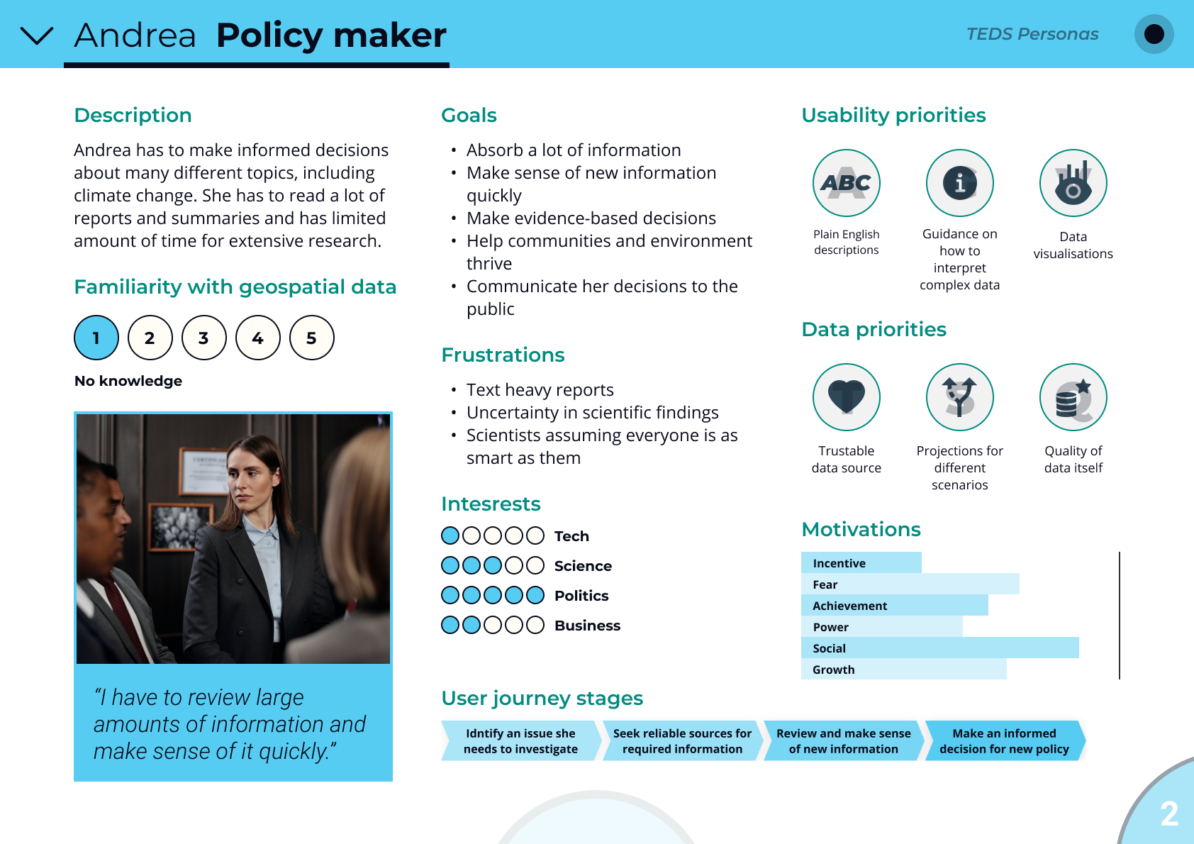 Below you can find some persona examples showing different types of user groups which could benefit from environmental data and services. They show how familiar each groups is with geospatial data and what are their goals, priorities and frustrations. These personas helped us to present research findings in a more digestible form and to keep user needs and frustrations at the forefront when thinking about new environmental data products and services that could benefit them.